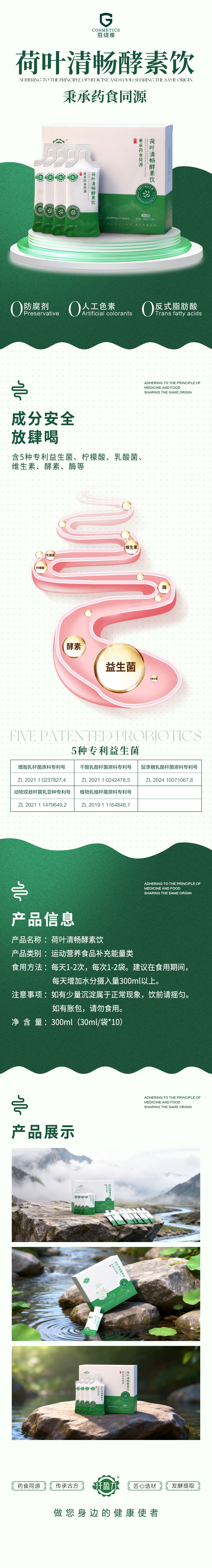 配料:水、L-阿拉伯糖、梨浓缩果汁、决明子火麻仁荷叶菊花茯苓植物发酵原液(发酵果蔬汁饮品)、果蔬植物发酵原液(发酵果蔬汁饮品)、低聚异麦芽糖、植物发酵原液(发酵果蔬汁饮品)【水、白砂糖(发酵用)、党参、西洋参、黄芪、天麻、灵芝、冻干型乳酸菌粉五菌复合(低聚异麦芽糖,鼠李糖乳酪杆菌JYLR-127,干酪乳酪杆菌L.Casei21,植物乳植杆菌JYLP-326,嗜酸乳杆菌 JYLA-191,动物双歧杆菌乳亚种JYBR-390)】、维生素C、柠檬酸、决明子火麻仁粉(固体饮料)、桃浓缩果汁