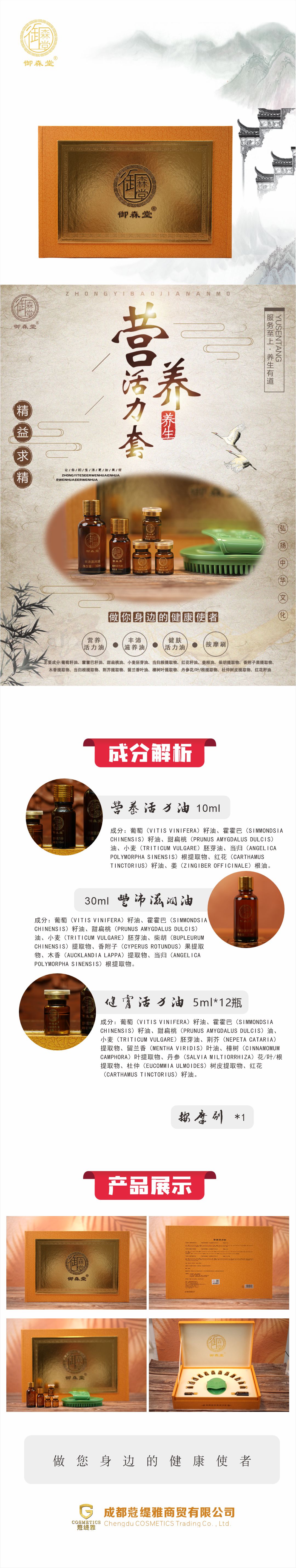 成分:葡萄(VITIS VINIFERA)籽油、霍霍巴(SIMMONDSIA CHINENSIS)籽油、甜扁桃(PRUNUS AMYGDALUS DULCIS)油、小麦(TRITICUM VULGARE)胚芽油、柴胡(BUPLEURUM CHINENSIS)提取物、香附子(CYPERUS ROTUNDUS)果提取物、木香(AUCKLANDIA LAPPA)提取物、当归(ANGELICA POLYMORPHA SINENSIS)根提取物。