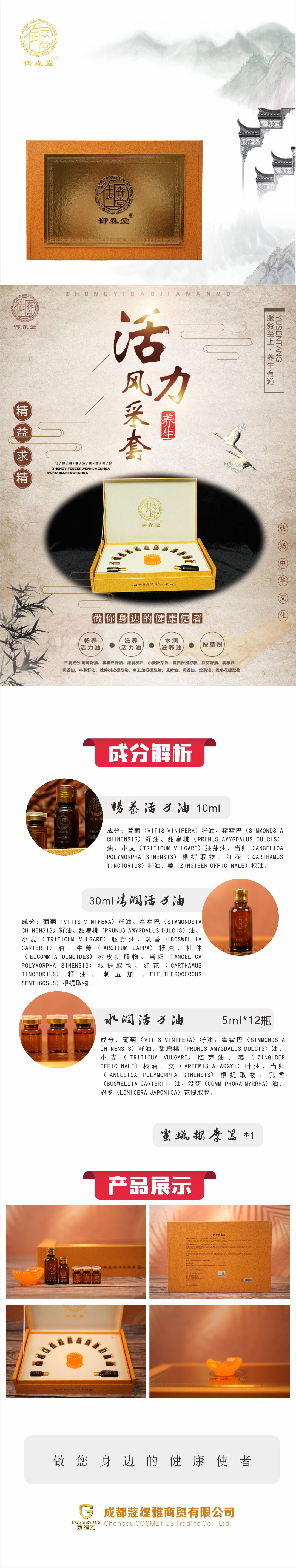 成分:葡萄(VITIS VINIFERA)籽油、霍霍巴(SIMMONDSIA CHINENSIS)籽油、甜扁桃(PRUNUS AMYGDALUS DULCIS)油、小麦(TRITICUM VULGARE)胚芽油、姜(ZINGIBER OFFICINALE)根油、艾(ARTEMISIA ARGYI)叶油、当归(ANGELICA POLYMORPHA SINENSIS)根提取物、乳香(BOSWELLIA CARTERII)油、没药(COMMIPHORA MYRRHA)油、忍冬(LONICERA JAPONICA)花提取物。