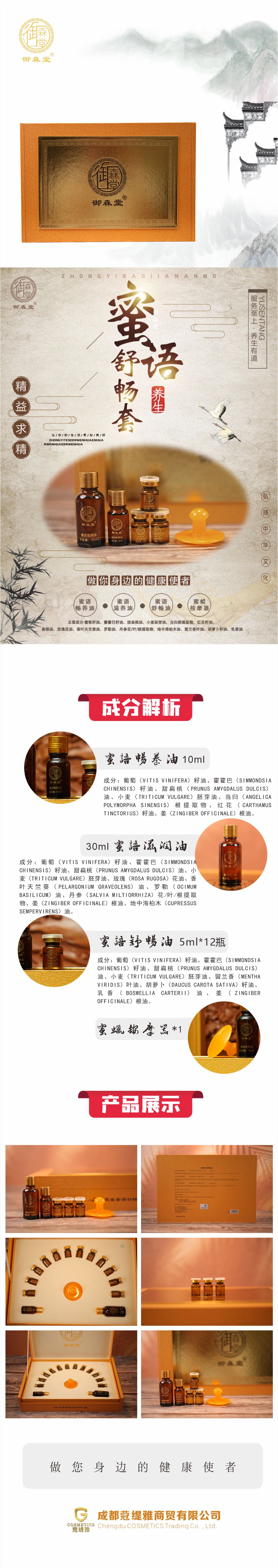 成分:葡萄(VITIS VINIFERA)籽油、霍霍巴(SIMMONDSIA CHINENSIS)籽油、甜扁桃(PRUNUS AMYGDALUS DULCIS)油、小麦(TRITICUM VULGARE)胚芽油、当归(ANGELICA POLYMORPHA SINENSIS)根提取物、红花(CARTHAMUS TINCTORIUS)籽油、姜(ZINGIBER OFFICINALE)根油。